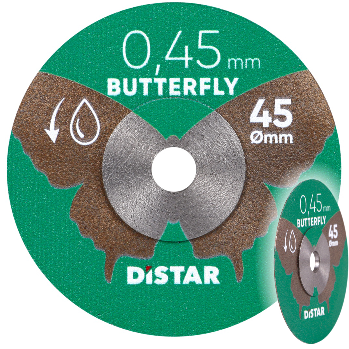 Диск на гравер Distar Butterfly 45 мм разработана для максимально аккуратной ручной резки. Тонкая структура диска толщиной всего 0,45 мм позволяет увеличить время автономной работы гравера на одном аккумуляторе до 30 %.